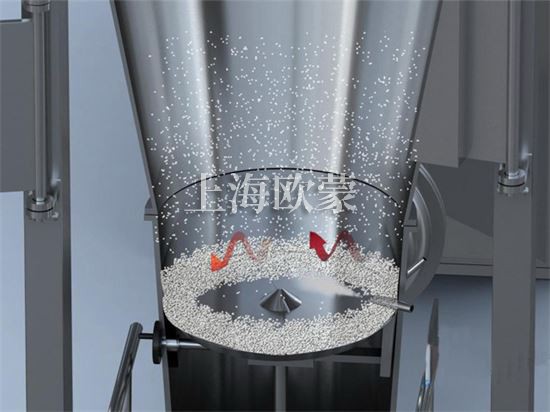 空氣經(jīng)加熱凈化后,由引風機從下部導入,穿過料斗的孔網(wǎng)板。在工作室內(nèi),經(jīng)攪拌和負壓作用形成流態(tài)化,水份快速蒸發(fā)后隨著排氣帶走,物料快速干燥。